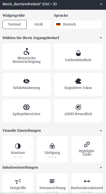 Das neue Barrierefreiheitsmenü befindet sich am linken Bildschirmrand mittig und ist über ein kleines, gut sichtbares Symbol dauerhaft erreichbar. Mit nur einem Klick öffnet sich ein umfassendes Menü, das individuell anpassbare Einstellungen für verschiedenste Zugangsbedürfnisse bietet. Personen mit motorischen Einschränkungen, Sehbehinderungen, ADHS, Epilepsie oder kognitiven Beeinträchtigungen können gezielt Funktionen aktivieren, die ihnen das Erkunden und Einkaufen auf unserer Seite erleichtern. Auch für Menschen mit Farbenblindheit gibt es speziell angepasste Darstellungen.