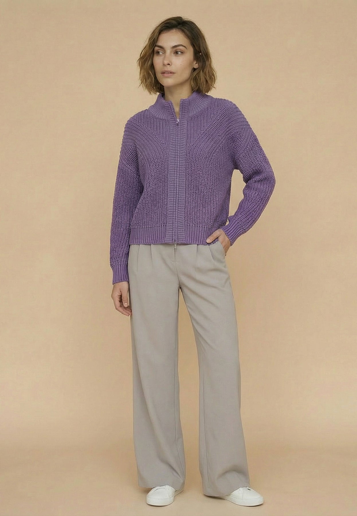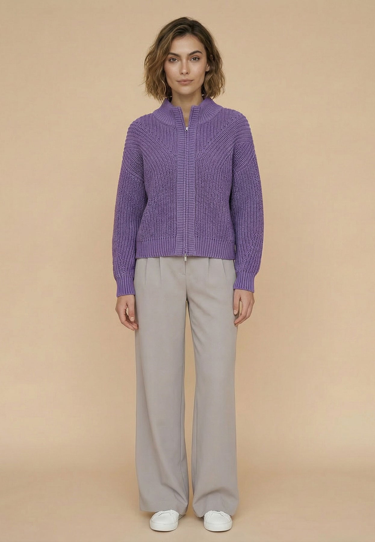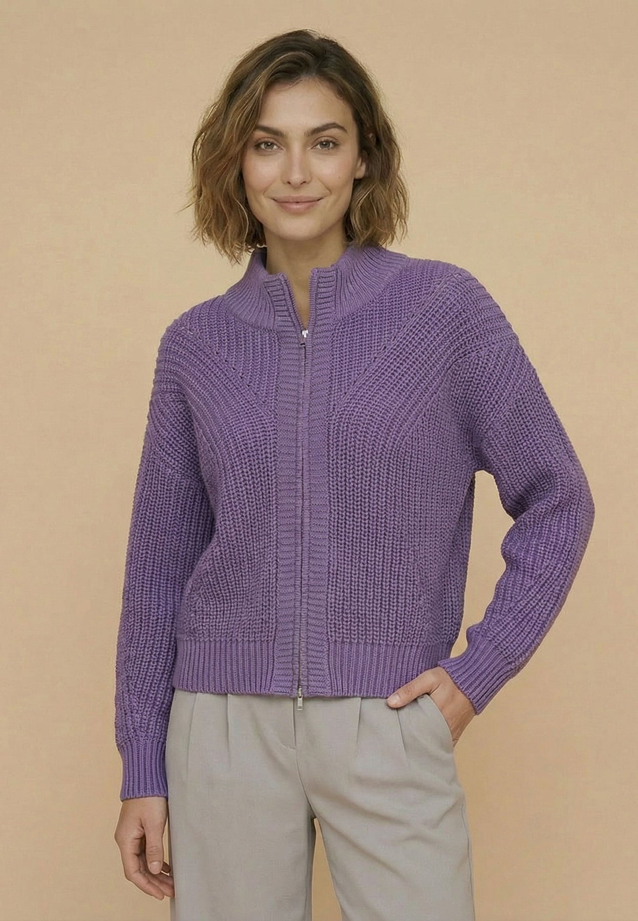 Cotton blend cardigan with a textured pattern and zip fastening