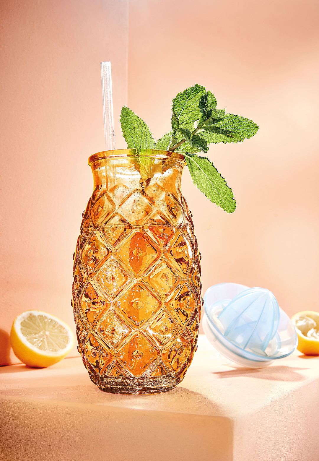 Orange, Zitrone und Limette direkt mit der integrierten Presse im Glas auspressen. Den Saft mit Honig oder Agavendicksaft leicht süßen und gut umrühren. Eiswürfel hinzufügen und mit gekühltem Mineralwasser auffüllen. Mit frischer Minze garnieren – fertig ist der perfekte Sommerdrink.